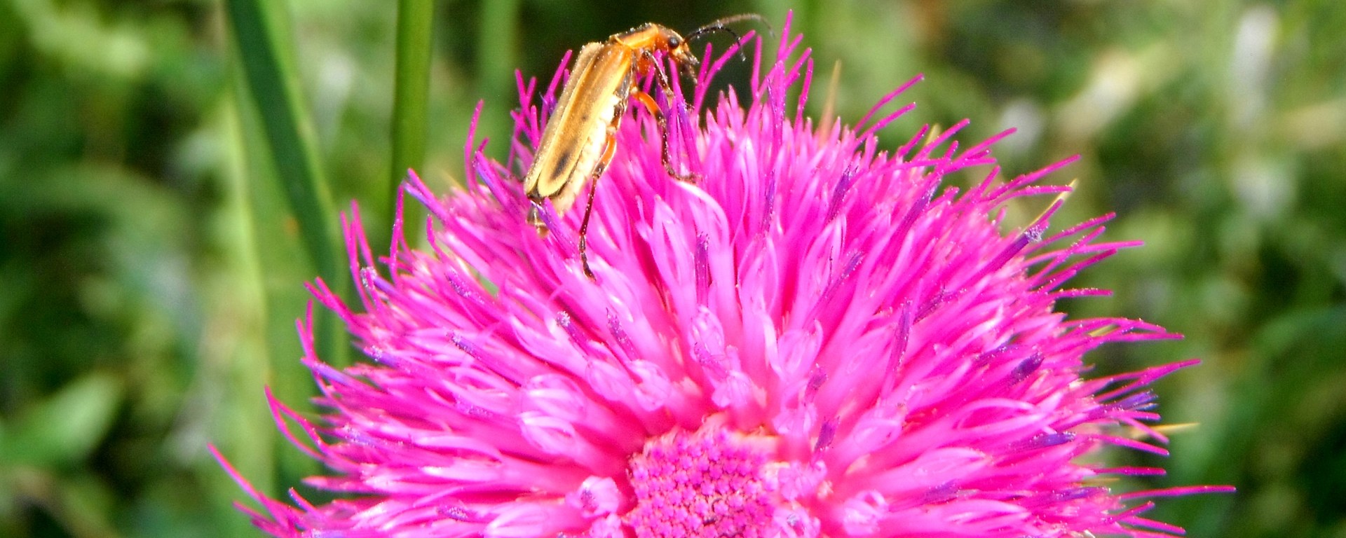 One tan and yellow insect caught my eye because she contrasted so sharply with the thistle’s flower she was inspecting, which was an eye-stinging shade of fuchsia. She didn’t seem to mind my staring at her since she continued on with her business as if I wasn’t there, as far as I could tell. She picked her way over the narrow petals, precisely placing each foot before moving another. Her antennae moved purposefully, and I saw in my mind a discerning shopper slowly making her way through the produce section inspecting each potato, each lime, and every apple. She was covered in yellow pollen, some of which she would leave behind, and some of which she would carry on to other flowers.