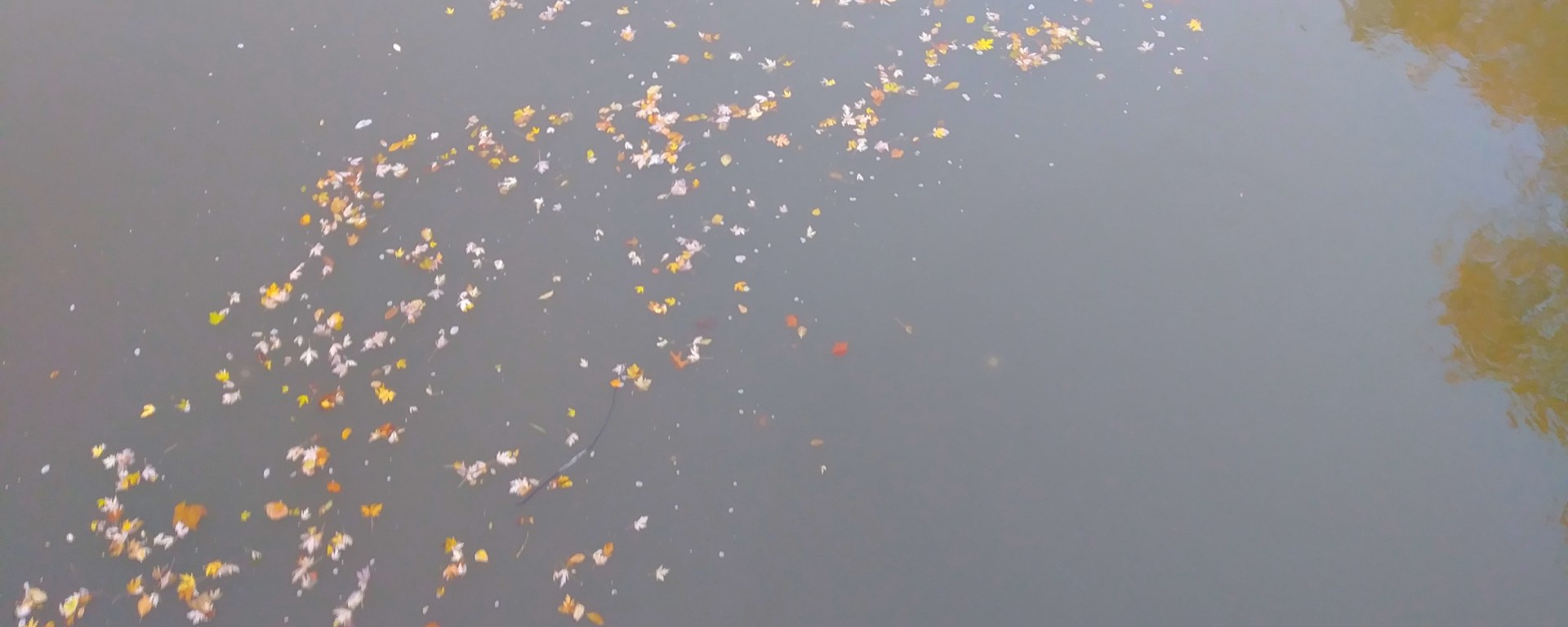 In the calm, crisp, post-first snowfall air of a rose-tinted autumn evening, after the day’s sun has melted most of the snow away, the river’s surface is so still when reflecting the trees’ bronze-patinaed foliage you’d almost think it was glass except for the gentle undulation of the solitary trail of gold-hued leaves silently gliding by underneath the bridge.