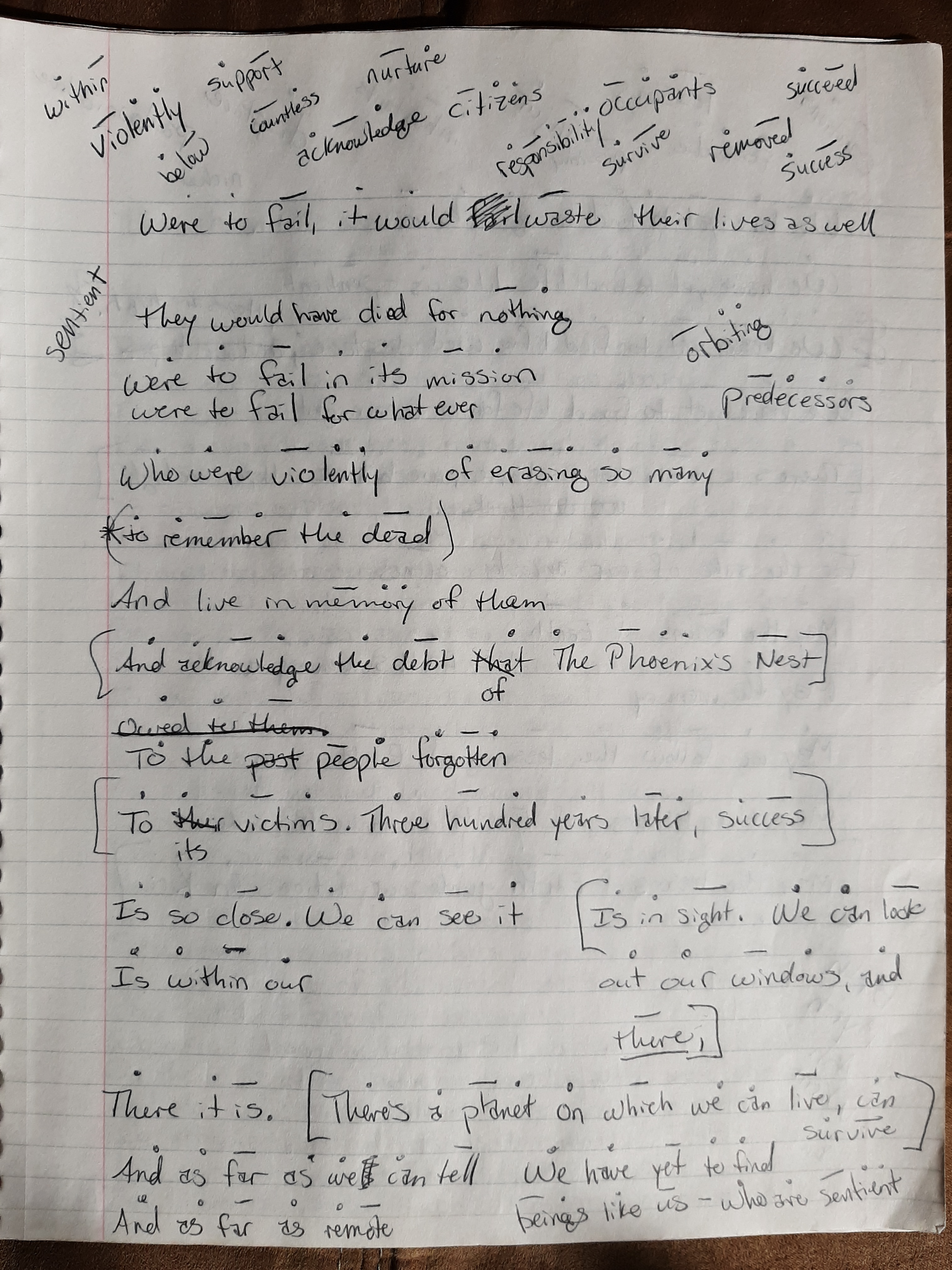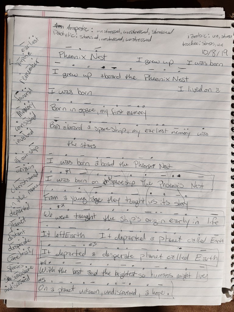 I chose to experiment with epic poetry because I wanted to write something expansive that told a story. The writing process for The Phoenix’s Nest took a month. I have 46 pages of scribbles, words with stress markers, discarded lines, and finished lines dated from October 8 to November 2. It was one of the most concentrated creative efforts I’ve attempted. The poem doesn’t necessarily fit into the typical definition of an epic poem. Among other things, an epic poem is book-length and involves fantastical or mythological events that happened in the distant past. Though 123 lines is long for a poem, but they are too short for a book, and the poem’s setting is the distant future. Of course, there’s nothing to say that an epic can’t be written in this manner, but a purist might take offense.