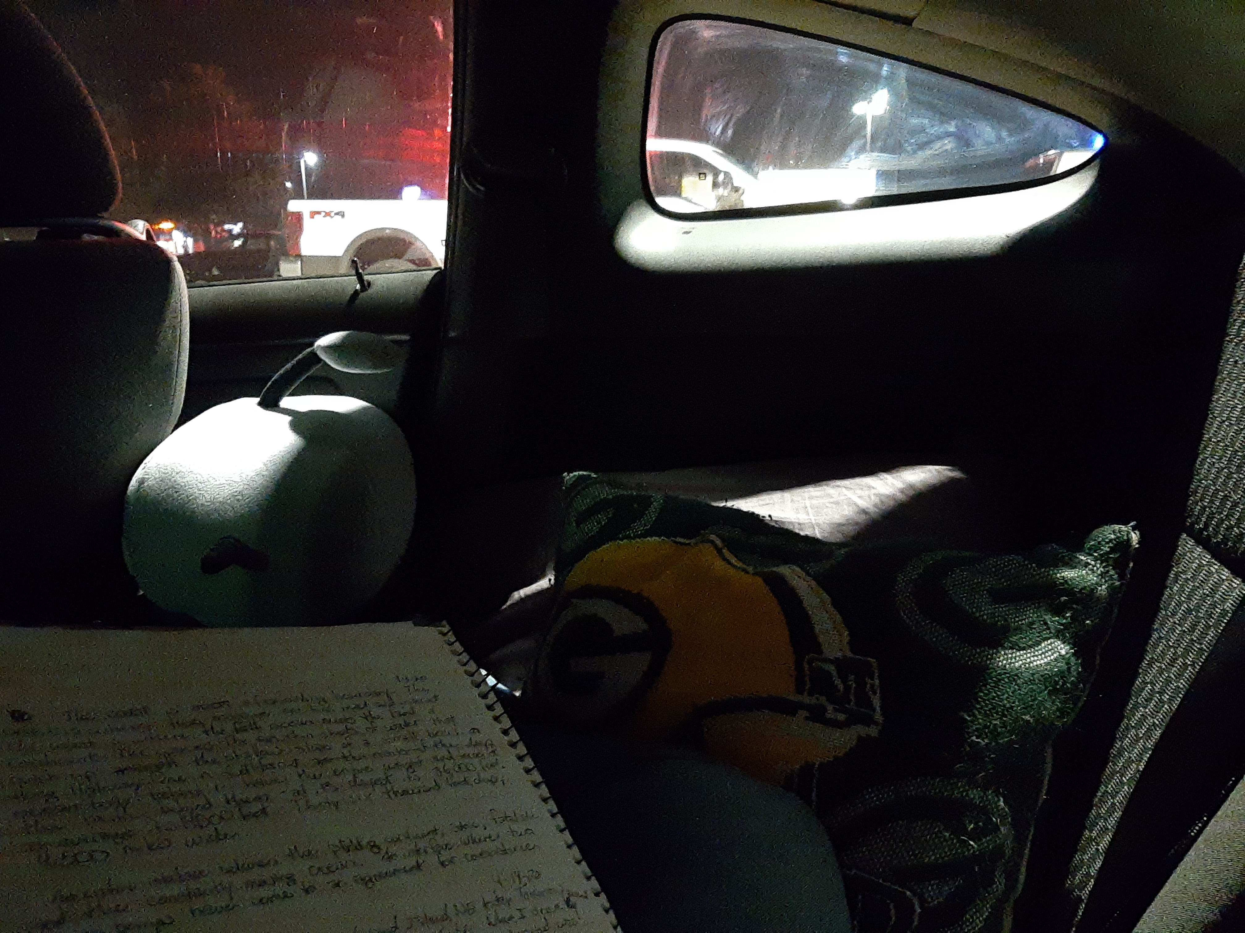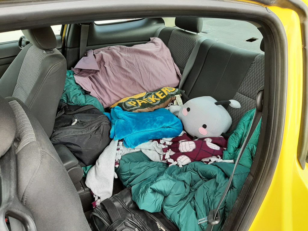 Now, I planned this out. I spent a month combing Amazon for air mattresses designed to fit in the back of a vehicle, but most of them were for vans or large SUVs with backseats anywhere from five to twelve inches longer than mine. I saw one review where a woman said the mattress fit in the back of her Prius, but by that point I was short on time and skeptical based on the solidly mediocre reviews I kept reading. So I gathered up all the spare blankets and pillows in the house and tossed them in the backseat after carefully packing the rest of my stuff to make a semi-level surface.