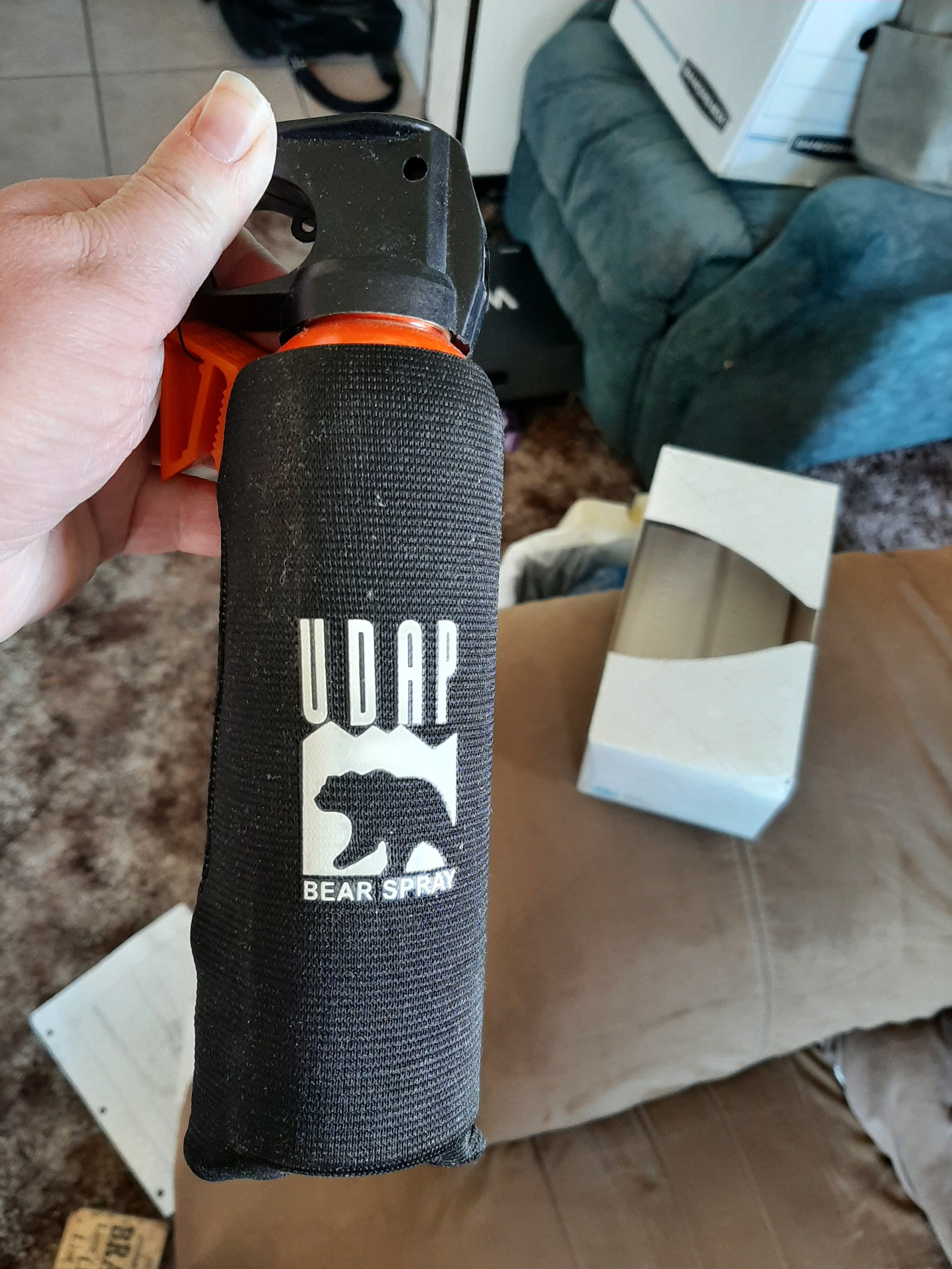 The only smart thing about what happened next was that I pointed the nozzle away from me. I pressed the trigger and a very loud, very large stream of pressurized liquid sprayed out and essentially attacked our potted lime tree. I released the trigger and glanced at the water bottle again, trying to figure out why the hell the contents were under pressure. That was when I finally registered the logo on the black sleeve. It said “UDAP Bear Spray” with a silhouette of a bear. That’s right. Not a water bottle, but bear spray. I sprayed BEAR SPRAY in my kitchen.