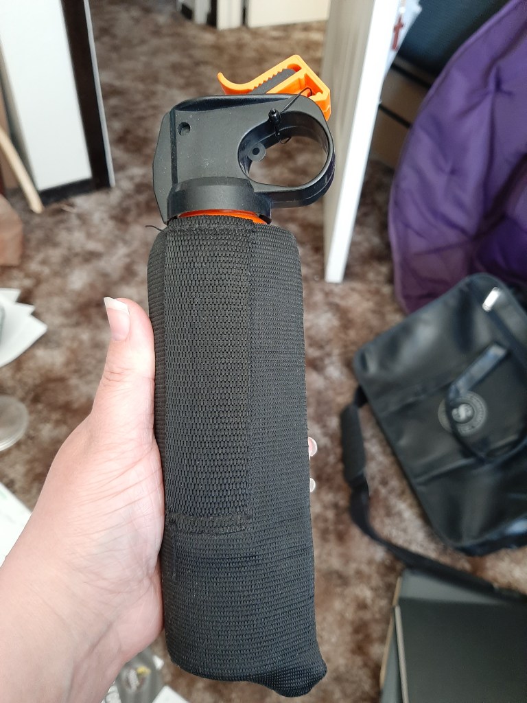 I would also like to state that when the bear spray lived on top of the knife block, it was always face down, at an angle. I was most used to seeing the “water bottle” like this:
