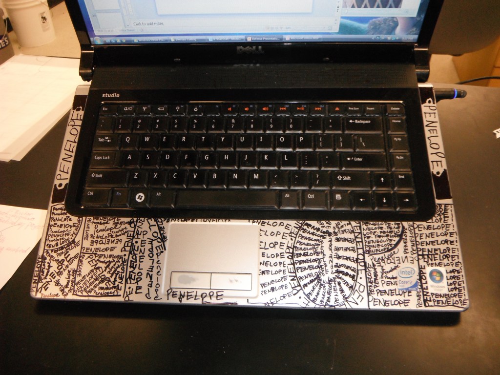 This photo is of my college laptop, which somehow lasted me all four years. If it wasn’t clear from the photo, I named that computer Penelope. This was taken on April 13, 2013, the spring semester of my senior year and two weeks before I presented my combination senior capstone and Honor’s thesis. I was probably under a lot of stress at this point. Given the fact that there aren’t any wear patterns in the permanent marker, I had probably just spent fifteen to twenty minutes renewing the graffiti rather than studying. I can tell from the tabletop and bucket in the upper left-hand corner that I was in the Structures classroom, and the clock visible in the lower right-hand corner of the computer screen tells me it was 10 PM. For context, April 13, 2013 was a Saturday. However, this memory is about the laptop, not my raging workaholism.
